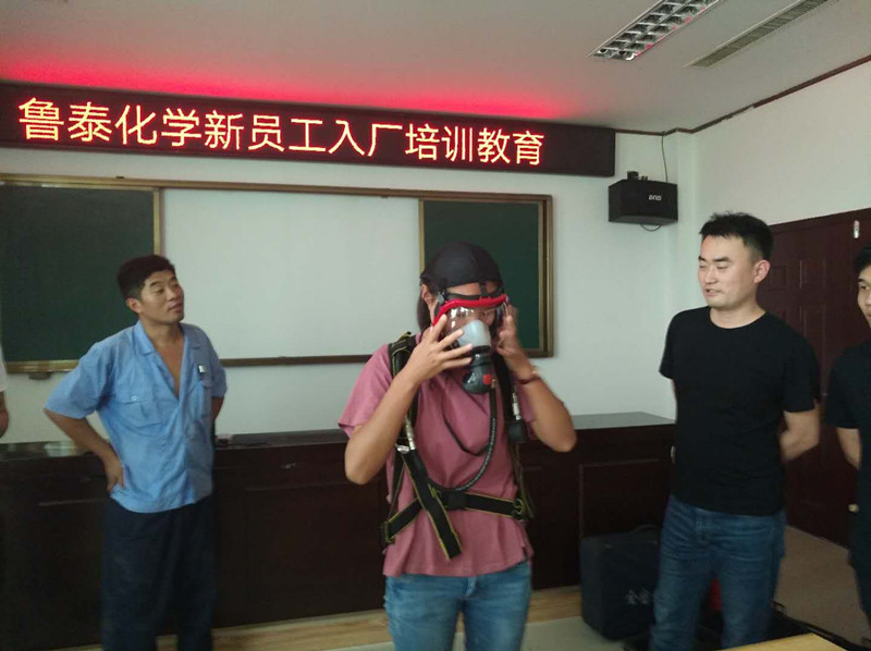 实操培训由氯碱车间兼职教师授课,培训老师详细介绍了过滤式防毒面具、正压式空气呼吸器、防化服的佩戴方法和干粉灭火器的正确使用,并逐一做了佩戴演示。培训老师边演示便强调注意事项、佩戴方法和技巧。学员们边认真听课,边提出疑惑问题,老师均做出详细解答。