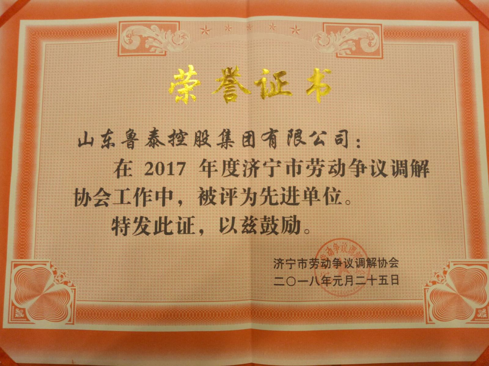 1月25日,济宁市劳动争议调解协会一届三次会员大会在香港大厦召开。会上,集团公司被授予"济宁市劳动争议调解协会先进单位"荣誉称号。