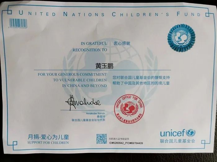 2023年12月18日,当黄玉鹏得知甘肃临夏州积石山县发生6.2级地震时,他决定将工资的一半捐到灾区,以微薄之力帮助灾区人民重建家园。为了能继续奉献爱心,黄玉鹏参与了“联合国儿童基金会中国区月捐计划”,每月捐赠75元,帮助困难儿童。事实上,这不是黄玉鹏唯一的爱心善举,刚入职的时候,他便加入了济宁市献血志愿队伍,只要收到血库告急的短信,他一定会出现在献血车上。